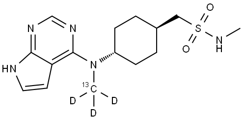 Oclacitinib-13C-d3 is intended for use as an internal standard for the quantification of oclacitinib (Item No. 18722) by GC- or LC-MS. Oclacitinib is an inhibitor of the JAK family kinases JAK1, JAK2, JAK3, and TYK2 (IC50s = 10, 18, 99, and 84 nM, respectively).1 It is selective for JAK kinases over a panel of 38 additional kinases at 1 μM. Oclacitinib inhibits LPS-induced increases in IL-12 and TNF-α levels in murine bone marrow-derived dendritic cells (BMDCs) in a concentration-dependent manner.2 Topical administration of oclacitinib (0.1, 0.25, and 0.5%) reduces scratching behavior and ear edema, as well as decreases levels of IL-1β, IL-4, and IL-6 in ear skin, in a mouse model of allergic dermatitis induced by toluene-2,3-diisocyanate (TDI). Formulations containing oclacitinib have been used in the treatment of pruritus associated with allergic dermatitis and the control of atopic dermatitis in dogs.WARNING This product is not for human or veterinary use.