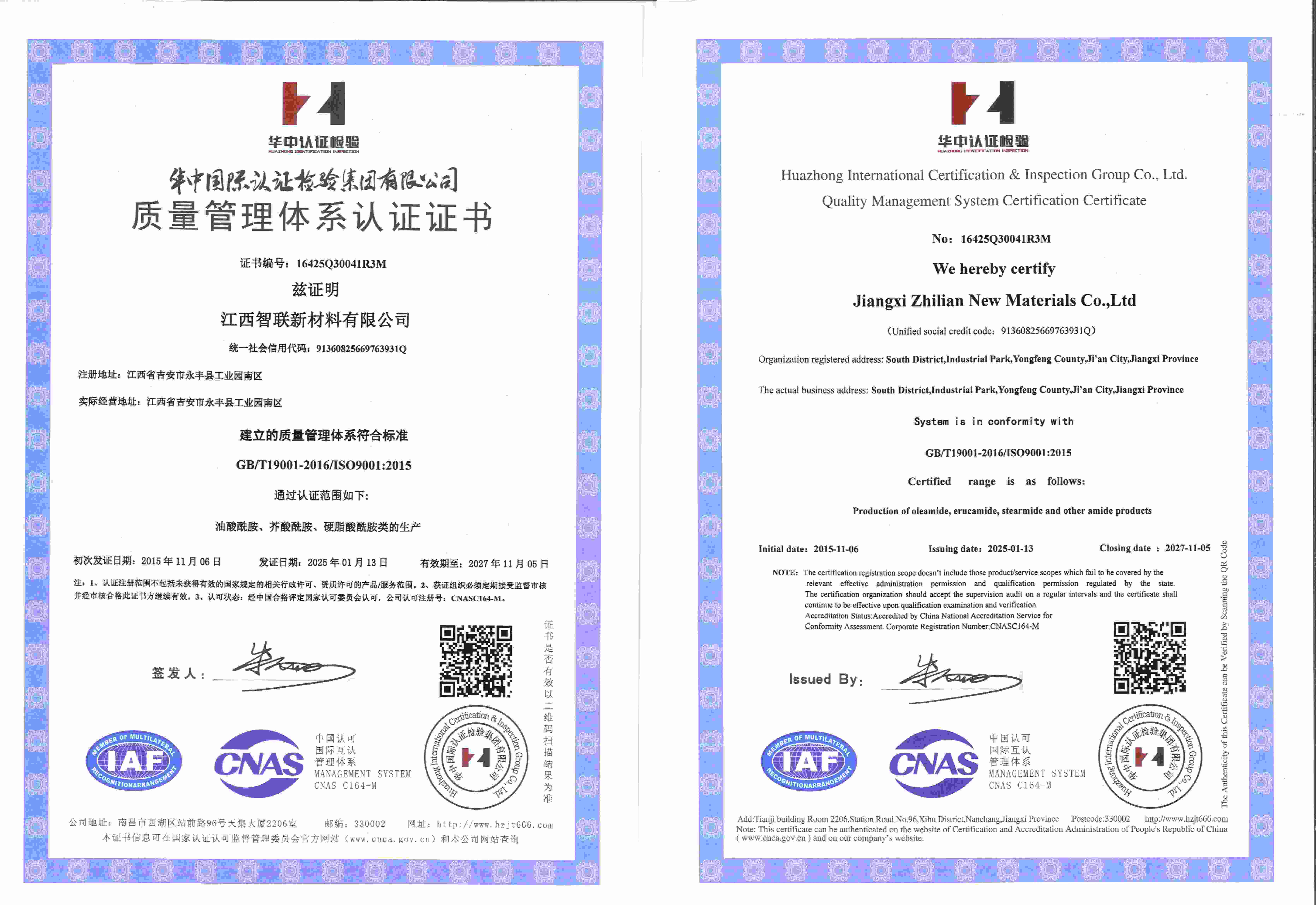江西智联新材料有限公司是国内生产油酸酰胺、芥酸酰胺、硬脂酸酰胺、EBS等酰胺类产品的领军企业。公司依托院士工作站、优秀的科研院所和自主研发优势,以创新的工艺技术和先进的生产设备,致力于橡塑(电线电缆、薄膜、鞋材、人造草坪、轮胎橡胶、色母粒)、油墨、涂料、皮革、钢铁、选矿、复合肥、钻井、造纸、石材、木塑、洗涤等领域的抗粘、爽滑、开口、分散、脱模、增亮、流平、抗静电等高效绿色环保功能型助剂的研发、生产和推广应用。 公司负责定制了“油酸酰胺”产品行业标准(HG/T4232-2011),荣获国家高新技术企业及省级民营企业荣誉称号,建立了职业健康体系,环境管理体系质量管理体系,产品通过SGS检测,符合欧盟ROHS指令,是中石化、中石油、中海油供应商。 以客户为重心,以市场为导向。经历二十年的历练与沉淀,我们将以优良的产品、诚信的服务、来满足客户的需求,智联与您共同发展,携手共创辉煌