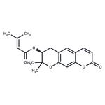 Decursin is a phytochemical originally isolated from A. gigas with diverse biological activities. It reduces the growth of B16/F10 murine melanoma cells, but not NIH-3T3 fibroblasts, via induction of apoptosis and increased caspase-3 activity when used at concentrations ranging from 40 to 100 μM. In vivo, decursin (10 mg/kg, i.p.) reduces tumor growth in a B16/F10 mouse xenograft model. Decursin inhibits RANKL-induced osteoclast differentiation and decreases fusion and migrations of pre-osteoclasts in vitro and prevents LPS-induced bone erosion in mice. In a mouse model of seizures induced by kainic acid , decursin (20 mg/kg) increases latency to the first electroencephalographic (EEG) discharge and attenuates the intensity and reduces the frequency of seizure discharges in the parietal cortex. Decursin inhibits tube formation and expression of VEGF receptor 2 (VEGFR2) in human retinal microvascular endothelial cells (HRMECs) and human umbilical vein endothelial cells (HUVECs) in vitro and reduces retinal expression of VEGFR2 and neovascularization in rats with diabetes induced by streptozotocin . It also reduces hepatic collagen expression, serum levels of ALT, AST, and ALP, and production of reactive oxygen species (ROS) in a mouse model of CCL4-induced liver fibrosis.