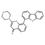 DNA-dependent protein kinase (DNA-PK) catalyzes nonhomologous end-joining, which is required to repair lethal DNA double-strand breaks. Because cells that are defective in DNA double-strand break repair are highly sensitive to ionizing radiation and topoisomerase II poisons, modulating DNA-PK is one strategy to defer cancer cell resistance to radiation or chemotherapeutic treatments. NU 7441 is a selective DNA-PK inhibitor with an IC50 value of 14 nM. It inhibits other members of the PI3K-related kinase family, including mTOR, PI3K, ataxia telangiectasia mutated (ATM), and ataxia telangiectasia and Rad3 related (ATR) with IC50 values of 1.7, 5, >100, and >100 μM, respectively. NU 7441 has been shown to increase the cytotoxicity of ionizing radiation and etoposide in human colon cancer cell lines in vitro and to potentiate the effects of etoposide in mice bearing human colon cancer xenograft tumors in vivo.