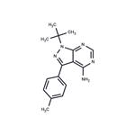 The Src family of non-receptor tyrosine kinases regulate cell adhesion, growth, and differentiation through activation of multiple intracellular signaling pathways. Normally inactive, Src kinases are transiently activated during mitosis and constitutively activated by abnormal mutations. PP1 is a potent, reversible, ATP-competitive, and selective inhibitor of the Src family of protein tyrosine kinases. It inhibits p56lck (IC50 = 5 nM), p59fynT (IC50 = 6 nM), Hck (IC50 = 20 nM), and Src (IC50 = 170 nM) without significantly affecting the activity of EGFR kinase (IC50 = 250 nM), JAK2 (IC50 = 50 μM), or ZAP-70 (IC50 ≥ 0.6 μM). PP1 inhibits anti-CD3-induced tyrosine phosphorylation of human T cells with an IC50 value of 600 nM. It exhibits antitumor activity by antagonizing both proliferation and the inhibition of apoptosis mediated by a stem cell factor/mast cell growth factor in hematopoietic and small cell lung cancer cell lines. PP1 also blocks TGF-β-mediated cellular responses by directly inhibiting type I TGF-β receptors (IC50 = 50 nM) in a manner unrelated to Src signaling.