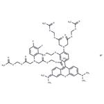 Rhod-FF AM is a cell-permeant acetoxymethyl ester of the fluorescent calcium indicator rhod-FF (Item No. 20433). As rhod-FF AM enters cells, it is hydrolyzed by intracellular esterases to produce rhod-FF. Rhod-FF is a difluorinated analog of the cell-impermeant calcium indicator rhod-2. It has a very low affinity for calcium (Kd = 320 µM).1 Low affinity calcium indicators are particularly useful for studying compartments with high concentrations of calcium, such as endoplasmic reticulum, where high affinity dyes will be insensitive to luminal fluctuations. Rhod-FF has excitation/emission maxima of approximately 552 and 580 nm, respectively.WARNING This product is not for human or veterinary use.