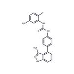 Receptor tyrosine kinases (RTKs) mediate critical signaling transduction pathways important for cell survival, growth, and differentiation. Whereas aberrant tyrosine kinase signaling is correlated with the progression of various cancers, RTK inhibitors are useful as cancer therapy agents. ABT-869 is an ATP-competitive, multi-targeted RTK inhibitor that is completely effective against all members of the vascular endothelial growth factor (VEGF) and platelet derived growth factor (PDGF) receptor families (e.g., KDR, FLT1, FLT3, FLT4, CSF-1R, and KIT) demonstrating IC50 values ranging from 4-190 nM. ABT-869 shows little activity against unrelated RTKs, cytoplasmic tyrosine kinases, or Ser/Thr kinases (IC50s > 1 μM). ABT-869 inhibits proliferation in MV-4-11 and MOLM-13 cells (acute myeloid leukemia cell lines harboring RTK mutations; IC50s = 4 and 6 nM, respectively), inducing apoptosis as evidenced by an increased sub-G0/G1 phase cell population, caspase activation, and PARP cleavage. In murine xenograft models, as well as in a phase 1 clinical trial, ABT-869 demonstrated respectable efficacy in solid tumors including lung and hepatocellular carcinomas.