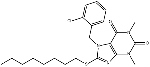 - Synonyms: 7-[(2-chlorophenyl)methyl]-1,3-dimethyl-8-octylsulfanylpurine-2,6-dione 1H-Purine-2,6-dione, 7-[(2-chlorophenyl)methyl]-3,7-dihydro-1,3-dimethyl-8-(octylthio)- 7-(2-CHLOROBENZYL)-1,3-DIMETHYL-8-(OCTYLTHIO)-3,7-DIHYDRO-1H-PURINE-2,6-DIONE