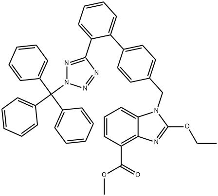 - Synonyms: GMLOSMKSNSOAIH-UHFFFAOYSA-N 1H-Benzimidazole-4-carboxylic acid, 2-ethoxy-1-[[2'-[2-(triphenylmethyl)-2H-tetrazol-5-yl][1,1'-biphenyl]-4-yl]methyl]-, methyl ester 2-Ethoxy-1-[[2'-[2-(trityl)-2H-tetrazol-5-yl][1,1'-biphenyl]-4-yl]methyl]-1H-benzimidazole-4-carboxylic Acid Methyl Ester (Candesartan Impurity)