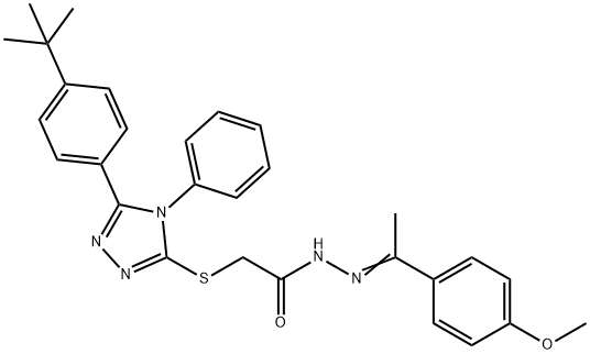 - Synonyms: 2-[[5-(4-tert-butylphenyl)-4-phenyl-1,2,4-triazol-3-yl]sulfanyl]-N-[(Z)-1-(4-methoxyphenyl)ethylideneamino]acetamide Acetic acid, 2-[[5-[4-(1,1-dimethylethyl)phenyl]-4-phenyl-4H-1,2,4-triazol-3-yl]thio]-, 2-[1-(4-methoxyphenyl)ethylidene]hydrazide 2-{[5-(4-TERT-BUTYLPHENYL)-4-PHENYL-4H-1,2,4-TRIAZOL-3-YL]SULFANYL}-N'-[(E)-1-(4-METHOXYPHENYL)ETHYLIDENE]ACETOHYDRAZIDE 2-{[5-(4-TERT-BUTYLPHENYL)-4-PHENYL-4H-1,2,4-TRIAZOL-3-YL]SULFANYL}-N'-[(E)-1-(4-METHOXYPHENYL)ETHYLIDENE]ACETOHYDRAZIDE