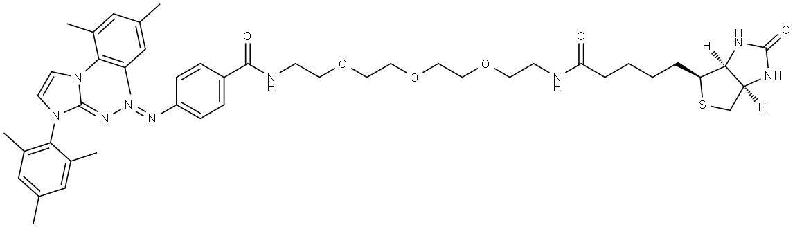 - Synonyms: BB1-CONH-PEG3-Biotin 1H-Thieno[3,4-d]imidazole-4-pentanamide, N-[1-[4-[(1E)-3-[1,3-dihydro-1,3-bis(2,4,6-trimethylphenyl)-2H-imidazol-2-ylidene]-1-triazen-1-yl]phenyl]-1-oxo-5,8,11-trioxa-2-azatridec-13-yl]hexahydro-2-oxo-, (3aS,4S,6aR)-
