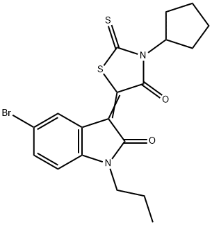 - Synonyms: (5Z)-5-(5-bromo-2-oxo-1-propylindol-3-ylidene)-3-cyclopentyl-2-sulfanylidene-1,3-thiazolidin-4-one 2H-Indol-2-one, 5-bromo-3-(3-cyclopentyl-4-oxo-2-thioxo-5-thiazolidinylidene)-1,3-dihydro-1-propyl- (3Z)-5-BROMO-3-(3-CYCLOPENTYL-4-OXO-2-THIOXO-1,3-THIAZOLIDIN-5-YLIDENE)-1-PROPYL-1,3-DIHYDRO-2H-INDOL-2-ONE