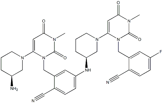 - Synonyms: 2-((6-((S)-3-Aminopiperidin-1-yl)-3-methyl-2,4-dioxo-3,4-dihydropyrimidin-1(2H)-yl)methyl)-4-(((S)-1-(3-(2-cyano-5-fluorobenzyl)-1-methyl-2,6-dioxo-1,2,3,6-tetrahydropyrimidin-4-yl)piperidin-3-yl)amino)benzonitrile
