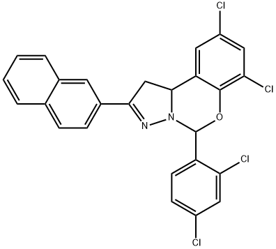 - Synonyms: 10,12-dichloro-7-(2,4-dichlorophenyl)-4-(naphthalen-2-yl)-8-oxa-5,6-diazatricyclo[7.4.0.0^{2,6}]trideca-1(9),4,10,12-tetraene 5H-Pyrazolo[1,5-c][1,3]benzoxazine, 7,9-dichloro-5-(2,4-dichlorophenyl)-1,10b-dihydro-2-(2-naphthalenyl)- 7,9-DICHLORO-5-(2,4-DICHLOROPHENYL)-2-(2-NAPHTHYL)-1,10B-DIHYDROPYRAZOLO[1,5-C][1,3]BENZOXAZINE