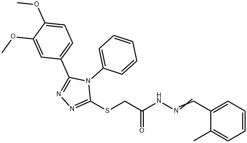 - Synonyms: 2-[[5-(3,4-dimethoxyphenyl)-4-phenyl-1,2,4-triazol-3-yl]sulfanyl]-N-[(Z)-(2-methylphenyl)methylideneamino]acetamide Acetic acid, 2-[[5-(3,4-dimethoxyphenyl)-4-phenyl-4H-1,2,4-triazol-3-yl]thio]-, 2-[(2-methylphenyl)methylene]hydrazide 2-{[5-(3,4-DIMETHOXYPHENYL)-4-PHENYL-4H-1,2,4-TRIAZOL-3-YL]SULFANYL}-N'-[(E)-(2-METHYLPHENYL)METHYLIDENE]ACETOHYDRAZIDE 2-{[5-(3,4-DIMETHOXYPHENYL)-4-PHENYL-4H-1,2,4-TRIAZOL-3-YL]SULFANYL}-N'-[(E)-(2-METHYLPHENYL)METHYLIDENE]ACETOHYDRAZIDE