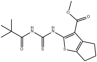 - Synonyms: methyl 2-({[(2,2-dimethylpropanoyl)amino]carbonothioyl}amino)-5,6-dihydro-4H-cyclopenta[b]thiophene-3-carboxylate 4H-Cyclopenta[b]thiophene-3-carboxylic acid, 2-[[[(2,2-dimethyl-1-oxopropyl)amino]thioxomethyl]amino]-5,6-dihydro-, methyl ester