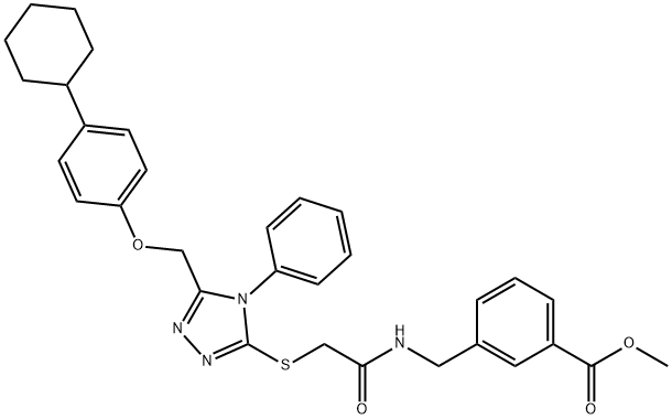 - Synonyms: methyl 3-((2-((5-((4-cyclohexylphenoxy)methyl)-4-phenyl-4H-1,2,4-triazol-3-yl)thio)acetamido)methyl)benzoate Benzoic acid, 3-[[[2-[[5-[(4-cyclohexylphenoxy)methyl]-4-phenyl-4H-1,2,4-triazol-3-yl]thio]acetyl]amino]methyl]-, methyl ester