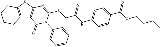 - Synonyms: butyl 4-(2-((4-oxo-3-phenyl-3,4,5,6,7,8-hexahydrobenzo[4,5]thieno[2,3-d]pyrimidin-2-yl)thio)acetamido)benzoate Benzoic acid, 4-[[2-[(3,4,5,6,7,8-hexahydro-4-oxo-3-phenyl[1]benzothieno[2,3-d]pyrimidin-2-yl)thio]acetyl]amino]-, butyl ester