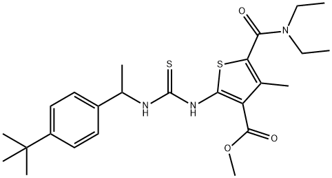 - Synonyms: methyl 2-(3-(1-(4-(tert-butyl)phenyl)ethyl)thioureido)-5-(diethylcarbamoyl)-4-methylthiophene-3-carboxylate 3-Thiophenecarboxylic acid, 5-[(diethylamino)carbonyl]-2-[[[[1-[4-(1,1-dimethylethyl)phenyl]ethyl]amino]thioxomethyl]amino]-4-methyl-, methyl ester