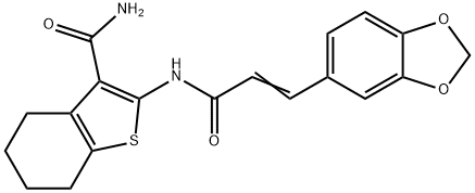 - Synonyms: 2-[[(E)-3-(1,3-benzodioxol-5-yl)prop-2-enoyl]amino]-4,5,6,7-tetrahydro-1-benzothiophene-3-carboxamide Benzo[b]thiophene-3-carboxamide, 2-[[3-(1,3-benzodioxol-5-yl)-1-oxo-2-propen-1-yl]amino]-4,5,6,7-tetrahydro-
