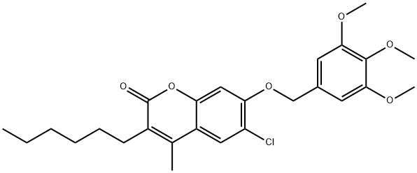 - Synonyms: 6-chloro-3-hexyl-4-methyl-7-[(3,4,5-trimethoxyphenyl)methoxy]chromen-2-one 2H-1-Benzopyran-2-one, 6-chloro-3-hexyl-4-methyl-7-[(3,4,5-trimethoxyphenyl)methoxy]-