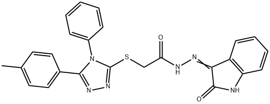 - 英文同义词: 2-[[5-(4-methylphenyl)-4-phenyl-1,2,4-triazol-3-yl]sulfanyl]-N'-(2-oxoindol-3-yl)acetohydrazide Acetic acid, 2-[[5-(4-methylphenyl)-4-phenyl-4H-1,2,4-triazol-3-yl]thio]-, 2-(1,2-dihydro-2-oxo-3H-indol-3-ylidene)hydrazide 2-{[5-(4-METHYLPHENYL)-4-PHENYL-4H-1,2,4-TRIAZOL-3-YL]SULFANYL}-N'-[(3Z)-2-OXO-1,2-DIHYDRO-3H-INDOL-3-YLIDENE]ACETOHYDRAZIDE 2-{[5-(4-METHYLPHENYL)-4-PHENYL-4H-1,2,4-TRIAZOL-3-YL]SULFANYL}-N'-[(3Z)-2-OXO-1,2-DIHYDRO-3H-INDOL-3-YLIDENE]ACETOHYDRAZIDE