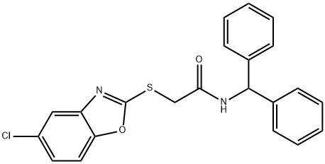 - Synonyms: Acetamide, 2-[(5-chloro-2-benzoxazolyl)thio]-N-(diphenylmethyl)- N-BENZHYDRYL-2-[(5-CHLORO-1,3-BENZOXAZOL-2-YL)SULFANYL]ACETAMIDE