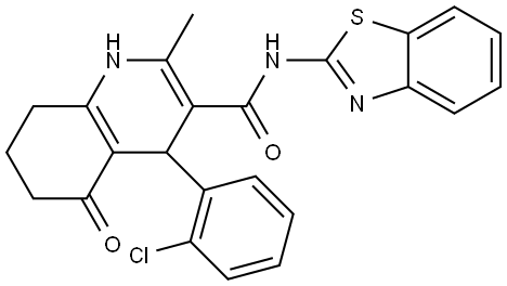 - Synonyms: N-(1,3-BENZOTHIAZOL-2-YL)-4-(2-CHLOROPHENYL)-2-METHYL-5-OXO-1,4,5,6,7,8-HEXAHYDRO-3-QUINOLINECARBOXAMIDE 3-Quinolinecarboxamide, N-2-benzothiazolyl-4-(2-chlorophenyl)-1,4,5,6,7,8-hexahydro-2-methyl-5-oxo-
