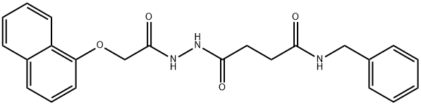 - Synonyms: N-benzyl-4-{2-[(1-naphthyloxy)acetyl]hydrazino}-4-oxobutanamide N-benzyl-4-{2-[(naphthalen-1-yloxy)acetyl]hydrazinyl}-4-oxobutanamide Butanoic acid, 4-oxo-4-[(phenylmethyl)amino]-, 2-[2-(1-naphthalenyloxy)acetyl]hydrazide