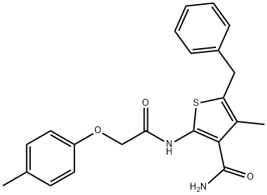 - Synonyms: 5-benzyl-4-methyl-2-{[(4-methylphenoxy)acetyl]amino}-3-thiophenecarboxamide 5-benzyl-4-methyl-2-{[(4-methylphenoxy)acetyl]amino}thiophene-3-carboxamide 3-Thiophenecarboxamide, 4-methyl-2-[[2-(4-methylphenoxy)acetyl]amino]-5-(phenylmethyl)-