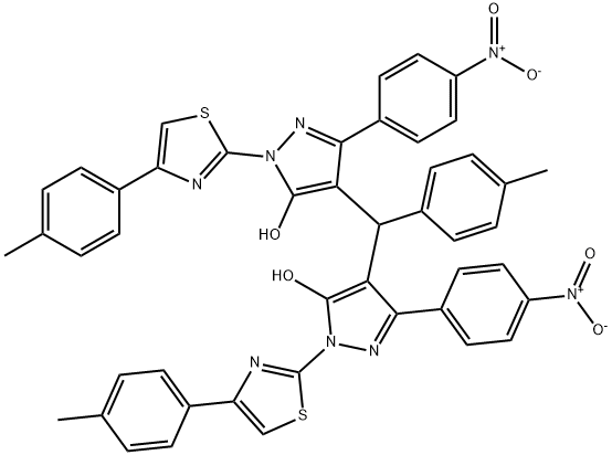 - Synonyms: 4,4'-[(4-methylphenyl)methylene]bis[1-[4-(4-methylphenyl)-1,3-thiazol-2-yl]-3-(4-nitrophenyl)-1H-pyrazol-5-ol] 4,4'-[(4-methylphenyl)methanediyl]bis{1-[4-(4-methylphenyl)-1,3-thiazol-2-yl]-3-(4-nitrophenyl)-1H-pyrazol-5-ol} 1H-Pyrazol-5-ol, 4,4'-[(4-methylphenyl)methylene]bis[1-[4-(4-methylphenyl)-2-thiazolyl]-3-(4-nitrophenyl)-