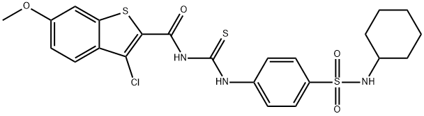 - Synonyms: 3-chloro-N-[({4-[(cyclohexylamino)sulfonyl]phenyl}amino)carbonothioyl]-6-methoxy-1-benzothiophene-2-carboxamide 3-chloro-N-{[4-(cyclohexylsulfamoyl)phenyl]carbamothioyl}-6-methoxy-1-benzothiophene-2-carboxamide Benzo[b]thiophene-2-carboxamide, 3-chloro-N-[[[4-[(cyclohexylamino)sulfonyl]phenyl]amino]thioxomethyl]-6-methoxy-