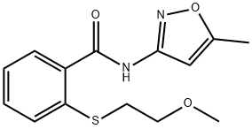 - Synonyms: 2-[(2-methoxyethyl)sulfanyl]-N-(5-methyl-1,2-oxazol-3-yl)benzamide Benzamide, 2-[(2-methoxyethyl)thio]-N-(5-methyl-3-isoxazolyl)-