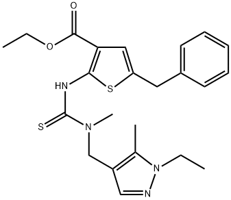 - Synonyms: ethyl 5-benzyl-2-(3-((1-ethyl-5-methyl-1H-pyrazol-4-yl)methyl)-3-methylthioureido)thiophene-3-carboxylate 3-Thiophenecarboxylic acid, 2-[[[[(1-ethyl-5-methyl-1H-pyrazol-4-yl)methyl]methylamino]thioxomethyl]amino]-5-(phenylmethyl)-, ethyl ester