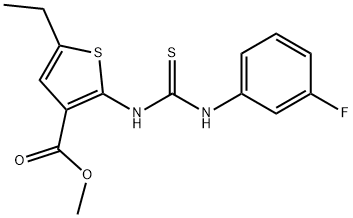 - Synonyms: methyl 5-ethyl-2-(3-(3-fluorophenyl)thioureido)thiophene-3-carboxylate 3-Thiophenecarboxylic acid, 5-ethyl-2-[[[(3-fluorophenyl)amino]thioxomethyl]amino]-, methyl ester