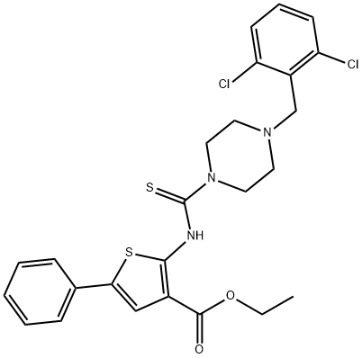 - Synonyms: ethyl 2-(4-(2,6-dichlorobenzyl)piperazine-1-carbothioamido)-5-phenylthiophene-3-carboxylate 3-Thiophenecarboxylic acid, 2-[[[4-[(2,6-dichlorophenyl)methyl]-1-piperazinyl]thioxomethyl]amino]-5-phenyl-, ethyl ester