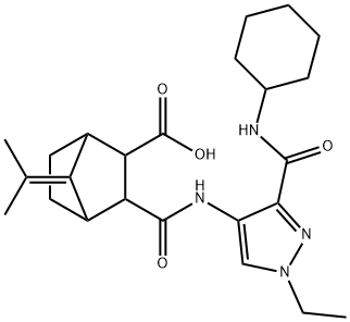 - Synonyms: 3-((3-(cyclohexylcarbamoyl)-1-ethyl-1H-pyrazol-4-yl)carbamoyl)-7-(propan-2-ylidene)bicyclo[2.2.1]heptane-2-carboxylic acid Bicyclo[2.2.1]heptane-2-carboxylic acid, 3-[[[3-[(cyclohexylamino)carbonyl]-1-ethyl-1H-pyrazol-4-yl]amino]carbonyl]-7-(1-methylethylidene)-