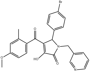 - Synonyms: 5-(4-bromophenyl)-3-hydroxy-4-(4-methoxy-2-methylbenzoyl)-1-(pyridin-3-ylmethyl)-1H-pyrrol-2(5H)-one 2H-Pyrrol-2-one, 5-(4-bromophenyl)-1,5-dihydro-3-hydroxy-4-(4-methoxy-2-methylbenzoyl)-1-(3-pyridinylmethyl)- 5-(4-BROMOPHENYL)-3-HYDROXY-4-(4-METHOXY-2-METHYLBENZOYL)-1-(3-PYRIDINYLMETHYL)-1,5-DIHYDRO-2H-PYRROL-2-ONE