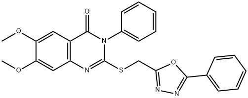 - Synonyms: 6,7-dimethoxy-3-phenyl-2-[(5-phenyl-1,3,4-oxadiazol-2-yl)methylsulfanyl]quinazolin-4-one 4(3H)-Quinazolinone, 6,7-dimethoxy-3-phenyl-2-[[(5-phenyl-1,3,4-oxadiazol-2-yl)methyl]thio]-