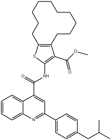- Synonyms: methyl 2-[[2-[4-(2-methylpropyl)phenyl]quinoline-4-carbonyl]amino]-4,5,6,7,8,9,10,11,12,13-decahydrocyclododeca[b]thiophene-3-carboxylate Cyclododeca[b]thiophene-3-carboxylic acid, 4,5,6,7,8,9,10,11,12,13-decahydro-2-[[[2-[4-(2-methylpropyl)phenyl]-4-quinolinyl]carbonyl]amino]-, methyl ester