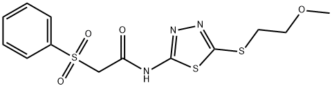 - Synonyms: 2-(benzenesulfonyl)-N-[5-(2-methoxyethylsulfanyl)-1,3,4-thiadiazol-2-yl]acetamide Acetamide, N-[5-[(2-methoxyethyl)thio]-1,3,4-thiadiazol-2-yl]-2-(phenylsulfonyl)-