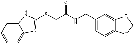 - Synonyms: 2-(1H-benzimidazol-2-ylsulfanyl)-N-(1,3-benzodioxol-5-ylmethyl)acetamide Acetamide, 2-(1H-benzimidazol-2-ylthio)-N-(1,3-benzodioxol-5-ylmethyl)-