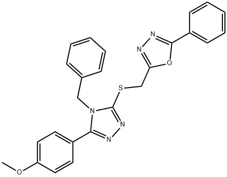 - Synonyms: 4-(4-benzyl-5-{[(5-phenyl-1,3,4-oxadiazol-2-yl)methyl]sulfanyl}-4H-1,2,4-triazol-3-yl)phenyl methyl ether 1,3,4-Oxadiazole, 2-[[[5-(4-methoxyphenyl)-4-(phenylmethyl)-4H-1,2,4-triazol-3-yl]thio]methyl]-5-phenyl-