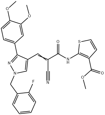 - Synonyms: (E)-methyl 2-(2-cyano-3-(3-(3,4-dimethoxyphenyl)-1-(2-fluorobenzyl)-1H-pyrazol-4-yl)acrylamido)thiophene-3-carboxylate 3-Thiophenecarboxylic acid, 2-[[2-cyano-3-[3-(3,4-dimethoxyphenyl)-1-[(2-fluorophenyl)methyl]-1H-pyrazol-4-yl]-1-oxo-2-propen-1-yl]amino]-, methyl ester