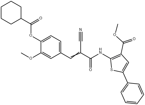 - Synonyms: (E)-methyl 2-(2-cyano-3-(4-((cyclohexanecarbonyl)oxy)-3-methoxyphenyl)acrylamido)-5-phenylthiophene-3-carboxylate 3-Thiophenecarboxylic acid, 2-[[2-cyano-3-[4-[(cyclohexylcarbonyl)oxy]-3-methoxyphenyl]-1-oxo-2-propen-1-yl]amino]-5-phenyl-, methyl ester