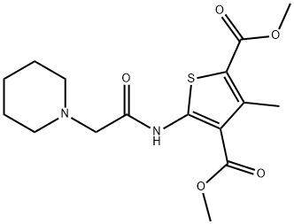 - Synonyms: dimethyl 3-methyl-5-(2-(piperidin-1-yl)acetamido)thiophene-2,4-dicarboxylate 2,4-Thiophenedicarboxylic acid, 3-methyl-5-[[2-(1-piperidinyl)acetyl]amino]-, 2,4-dimethyl ester