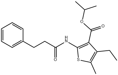- Synonyms: propan-2-yl 4-ethyl-5-methyl-2-(3-phenylpropanoylamino)thiophene-3-carboxylate 3-Thiophenecarboxylic acid, 4-ethyl-5-methyl-2-[(1-oxo-3-phenylpropyl)amino]-, 1-methylethyl ester
