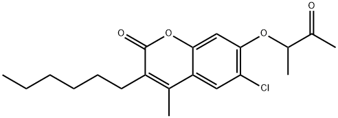 - Synonyms: 6-chloro-3-hexyl-4-methyl-7-(3-oxobutan-2-yloxy)chromen-2-one 2H-1-Benzopyran-2-one, 6-chloro-3-hexyl-4-methyl-7-(1-methyl-2-oxopropoxy)-