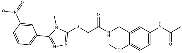 - Synonyms: N-[(5-acetamido-2-methoxyphenyl)methyl]-2-[[4-methyl-5-(3-nitrophenyl)-1,2,4-triazol-3-yl]sulfanyl]acetamide Acetamide, N-[[5-(acetylamino)-2-methoxyphenyl]methyl]-2-[[4-methyl-5-(3-nitrophenyl)-4H-1,2,4-triazol-3-yl]thio]-