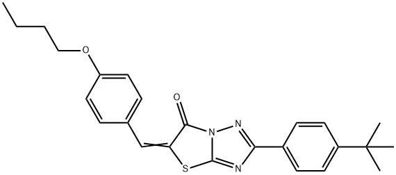 - Synonyms: (5Z)-5-[(4-butoxyphenyl)methylidene]-2-(4-tert-butylphenyl)-[1,3]thiazolo[3,2-b][1,2,4]triazol-6-one (5E)-5-[(4-butoxyphenyl)methylidene]-2-(4-tert-butylphenyl)-[1,3]thiazolo[3,2-b][1,2,4]triazol-6-one Thiazolo[3,2-b][1,2,4]triazol-6(5H)-one, 5-[(4-butoxyphenyl)methylene]-2-[4-(1,1-dimethylethyl)phenyl]- (5E)-5-(4-BUTOXYBENZYLIDENE)-2-(4-TERT-BUTYLPHENYL)[1,3]THIAZOLO[3,2-B][1,2,4]TRIAZOL-6(5H)-ONE