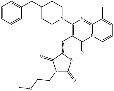 - Synonyms: (5Z)-5-[[2-(4-benzylpiperidin-1-yl)-9-methyl-4-oxopyrido[1,2-a]pyrimidin-3-yl]methylidene]-3-(2-methoxyethyl)-2-sulfanylidene-1,3-thiazolidin-4-one 4H-Pyrido[1,2-a]pyrimidin-4-one, 3-[[3-(2-methoxyethyl)-4-oxo-2-thioxo-5-thiazolidinylidene]methyl]-9-methyl-2-[4-(phenylmethyl)-1-piperidinyl]- 2-(4-BENZYL-1-PIPERIDINYL)-3-{(E)-[3-(2-METHOXYETHYL)-4-OXO-2-THIOXO-1,3-THIAZOLIDIN-5-YLIDENE]METHYL}-9-METHYL-4H-PYRIDO[1,2-A]PYRIMIDIN-4-ONE