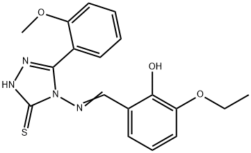 - 英文同义词: SALOR-INT L231282-1EA 2-ETHOXY-6-(((3-MERCAPTO-5-(2-METHOXY-PH)-4H-1,2,4-TRIAZOL-4-YL)IMINO)ME)PHENOL (E)-2-ethoxy-6-(((3-mercapto-5-(2-methoxyphenyl)-4H-1,2,4-triazol-4-yl)imino)methyl)phenol 3H-1,2,4-Triazole-3-thione, 4-[[(3-ethoxy-2-hydroxyphenyl)methylene]amino]-2,4-dihydro-5-(2-methoxyphenyl)-
