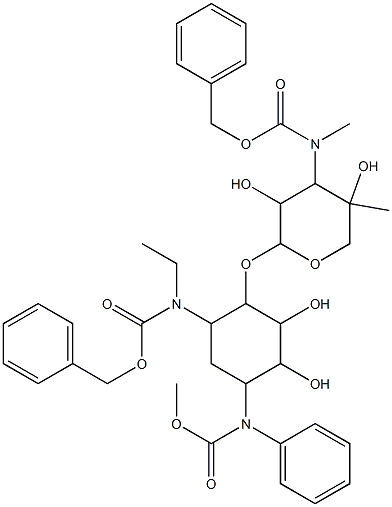 - Synonyms: 2-Deoxy-6-O-[3-deoxy-4-C-methyl-3-[methyl[(phenylmethoxy)carbonyl]amino]-2-L-arabinopyranosyl]-N1-ethyl-N1,N3-bis[(phenylmethoxy)carbonyl]-D-streptamine 2-Deoxy-6-O-[3-deoxy-4-C-methyl-3-[methyl[(phenylmethoxy)carbonyl]amino]-β-L-arabinopyranosyl]-N1-ethyl-N1,N3-bis[(phenylmethoxy)carbonyl]-D-streptamine D-Streptamine, 2-deoxy-6-O-[3-deoxy-4-C-methyl-3-[methyl[(phenylmethoxy)carbonyl]amino]-β-L-arabinopyranosyl]-N1-ethyl-N1,N3-bis[(phenylmethoxy)carbonyl]- (9CI)