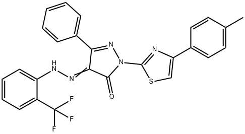 - Synonyms: 2-[4-(4-methylphenyl)-1,3-thiazol-2-yl]-5-phenyl-4-{[2-(trifluoromethyl)phenyl]hydrazono}-2,4-dihydro-3H-pyrazol-3-one (4Z)-2-[4-(4-methylphenyl)-1,3-thiazol-2-yl]-5-phenyl-4-{2-[2-(trifluoromethyl)phenyl]hydrazinylidene}-2,4-dihydro-3H-pyrazol-3-one 1H-Pyrazole-4,5-dione, 1-[4-(4-methylphenyl)-2-thiazolyl]-3-phenyl-, 4-[2-[2-(trifluoromethyl)phenyl]hydrazone]